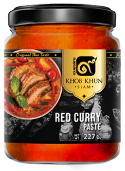 Red curry is made from dried chili, red onion, coriander root, galangal, garlic, kaffir lime leaves and shrimp paste. Red curry paste can be used for cooking in different type of food like roasted dunk red curry.